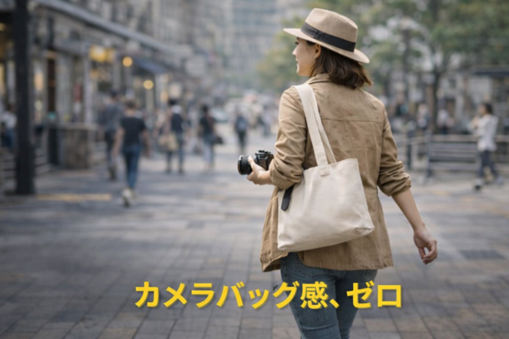 トート型やシンプルなショルダータイプなら、カメラを入れても普通のバッグに見えます。結果として撮影目的でなくても持ち歩けるようになります。