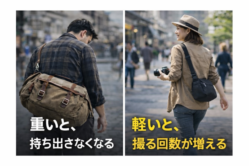 同じ機材でもバッグが軽いだけで疲労感は大きく変わります。特に街歩きや旅行撮影では、軽さが快適さに直結します。