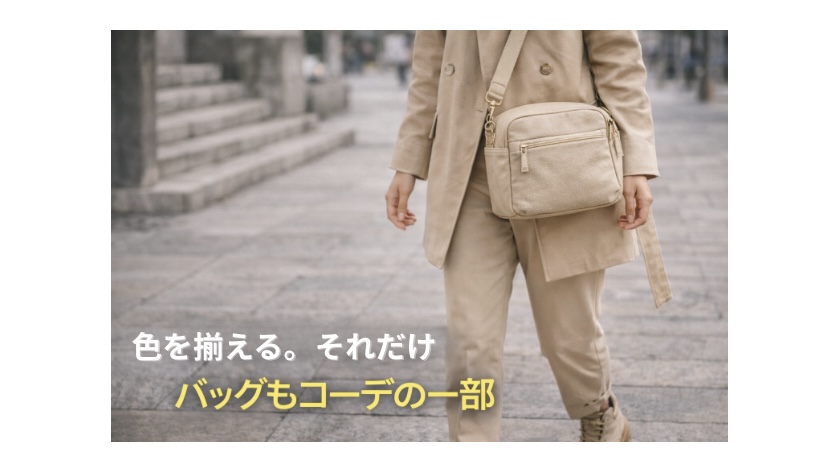 黒・ネイビー・ベージュなどのベーシックカラーは、どんな服にも合わせやすく失敗しにくいです。服がシンプルな日はバッグで質感を、服が主役の日はバッグを控えめにするのもポイント。