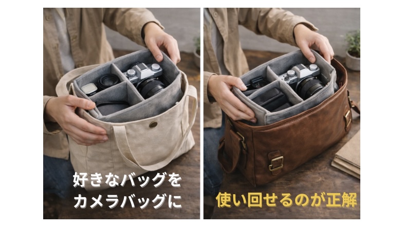 専用カメラバッグは便利ですが、デザインが限定されがちです。バッグインバッグなら、好きなバッグをそのままカメラバッグとして使えます。