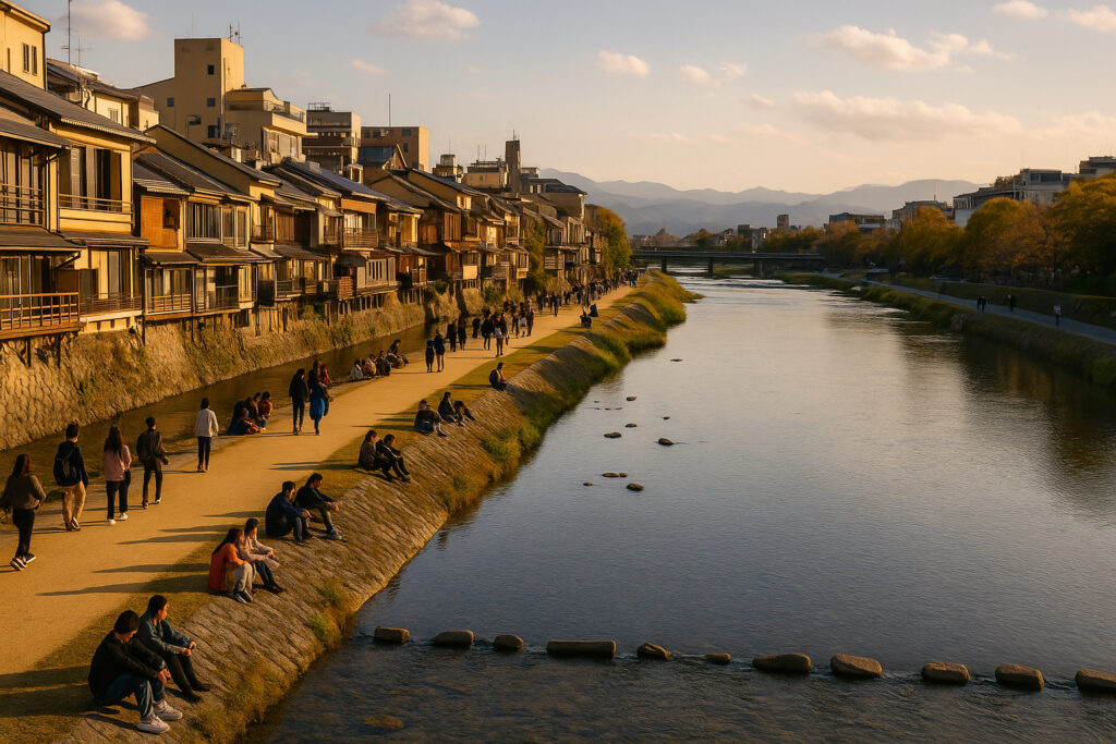 鴨川沿いは観光名所とは異なる『生活感ある京都』を撮影できるスポットです。
