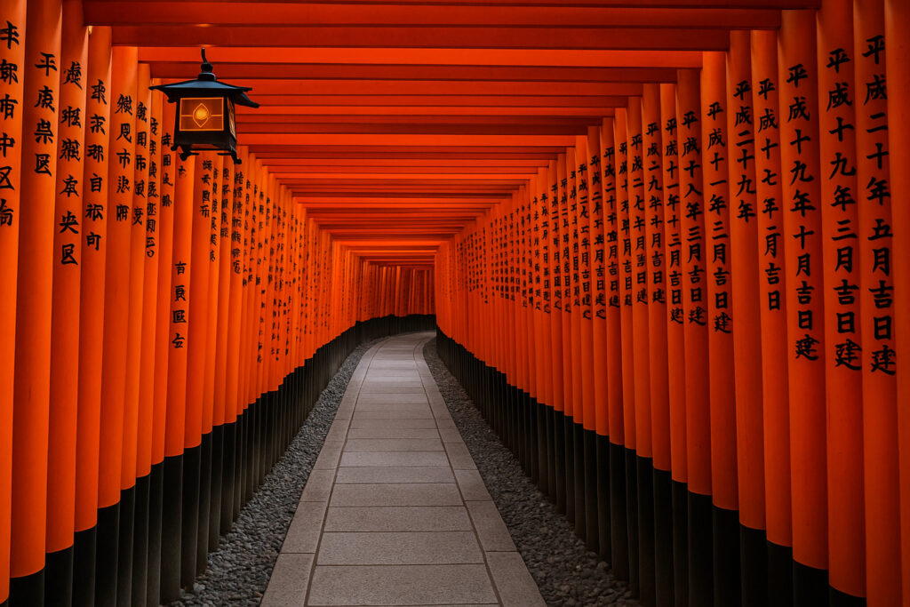 祇園白河の石畳と町家は和装ポートレートに最適で、伏見稲荷大社の千本鳥居は圧倒的なスケール感を演出します。