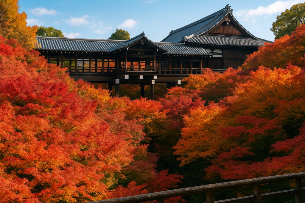 秋の東福寺は燃えるような紅葉が広がり、冬の金閣寺は雪化粧で幻想的な輝きを放ちます。