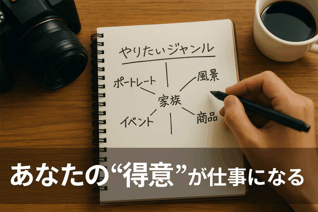 「ペットが好き」ならペット撮影、「料理が得意」なら飲食店のメニュー写真など、自分の生活や趣味と掛け合わせることで無理なく続けられます。