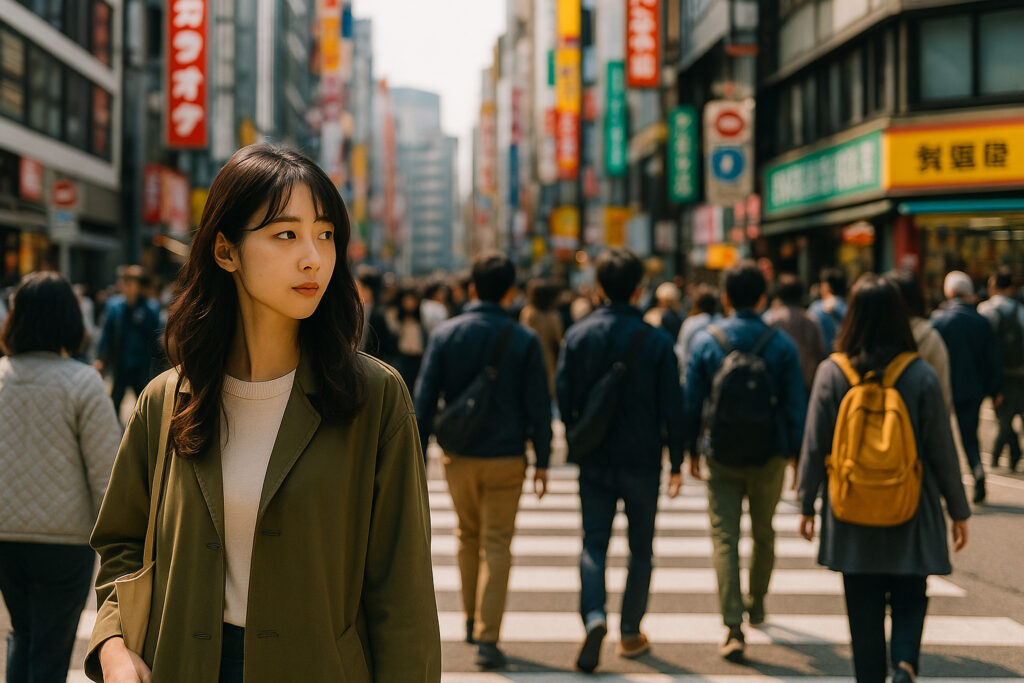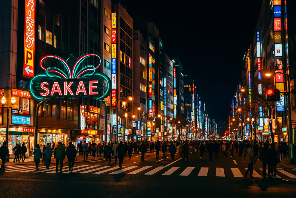 ネオンや大型ビジョンが織りなす光景と、多くの人々の動きが都会的な活気を生み出します。