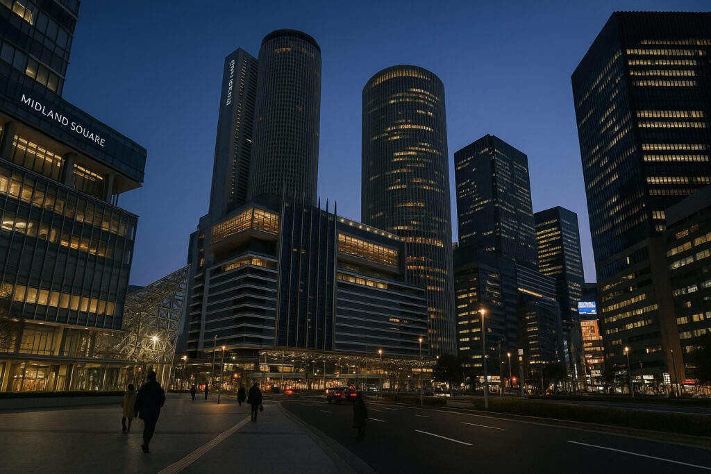 名古屋駅周辺は、都市のダイナミズムを感じられるスポットです。JPタワーやミッドランドスクエアといった高層ビル群を背景に通勤風景を切り取れば、経済都市の力強さを表現できます。