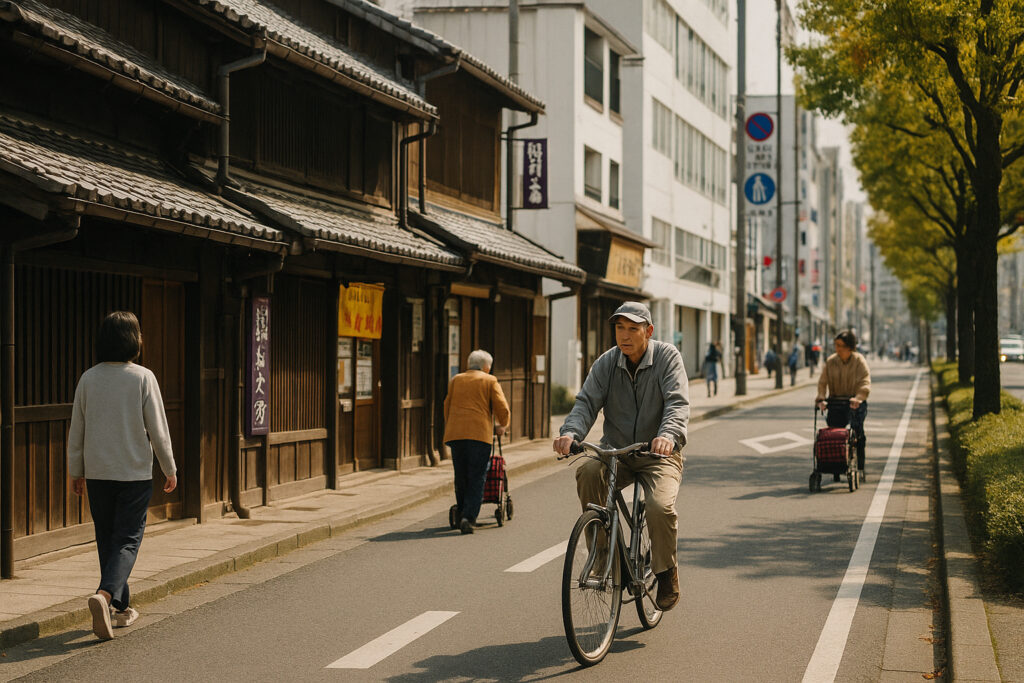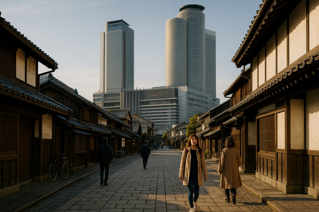 古い町家や神社の横にガラス張りの高層ビルがそびえ立つ光景は、他都市にはない独自の雰囲気を生み出しています。